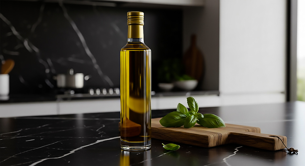 This elegant mockup showcases a premium olive oil bottle standing confidently on a sleek, modern kitchen counter. The dark marble texture, soft natural lighting, and fresh basil leaves create a refined gourmet atmosphere—perfect for premium food branding, packaging presentations, or high-end culinary visuals.